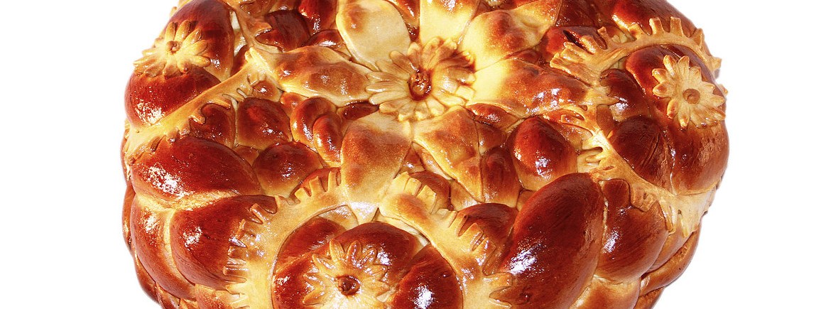 Colac dulce în formă de pâine rotundă din făină de grâu superioară după o rețetă tradițională.